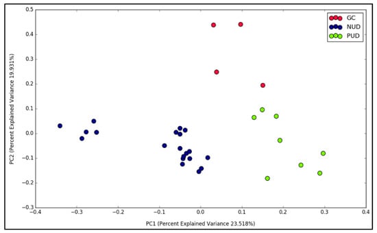 Due to small GC sample size (n = 4), comparison of bacterial genera abundances by Wilcoxon ranked-sum testing was performed only between NUD and PUD groups. Following Bonferroni correction, of 55 genera tested, only one appeared significant, which is Cutibacterium (adjusted p = 0.005, median abundances of 0.159% and 0.002% for NUD and PUD, respectively).