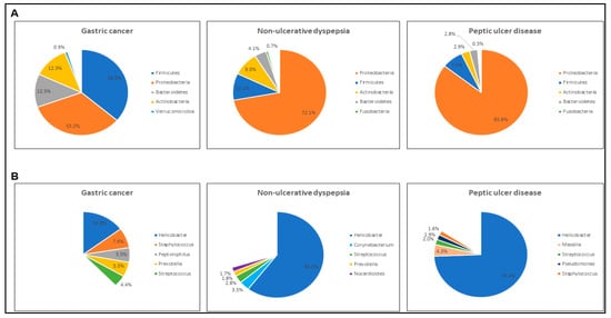 Bacterial phyla and genera compositions in modern Malaysians with gastric cancer, peptic ulcer disease and non-ulcerative dyspepsia. (A) Mean relative abundances of the five most dominating bacterial phyla in each disease group. (B) Mean relative abundances of the five most dominating bacterial genera in each disease group.