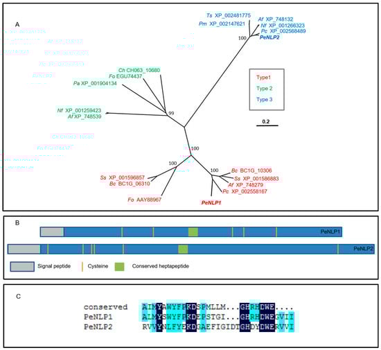 Characterization of the two NLP genes of P. expansum. (A) An un-rooted phylogenetic tree representing comparison of fungal NLP sequences from GenBank. The alignment was performed using Mega7. NLP type is designated by color. The scale bar represents weighted sequence divergence. The percentage of replicate trees in which the associated taxa clustered together in the bootstrap test (100 replicates) are shown next to the relevant branches. The title of the protein sequences is as follows: organism name is abbreviated by the first two letters, followed by the GenBank protein accession number. Af, Aspergillus fumigates Af293; Bc, B. cinerea; Ch, Colletotrichum higginsianum; Fo, Fusarium oxysporum; Nf, Neosartorya fischeri NRRL181; Pa, Podospora anserine S mat+; Pc, Penicillium chrysogenum Wisconsin 54-1255; Pm, Penicillium marnefferi ATCC 18224; Ss, Sclerotinia sclerotiorum 1980 UF-70, Ts, Talaromyces stipitatus ATCC 10500. (B) Schematic representation of PeNLP1 and PeNLP2. (C) Protein sequence alignment of the conserved nlp24 peptide [25] to the corresponding regions of PeNLP1 and PeNLP2. The amino acids are shaded (100%: black, 50%: light blue).