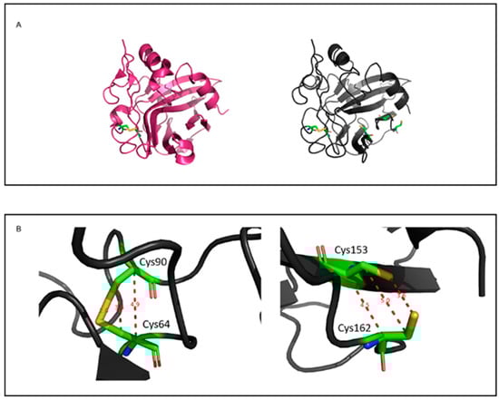 Analysis of potential disulfide bonds in PeNLP1. (A) Predicted 3D structures of template (PDB 3ST1) and target (NLP-1 modeled using SWISS-MODEL) in pink and gray, respectively. Cysteine residues are shown in sticks, colored by atoms (carbon in green, oxygen in red, nitrogen in blue and sulfur in yellow). (B) Distances between carbon-α, carbon-β and sulfur atoms of cysteine residues in the model structure of NLP-1. The figures were generated using Pymol.