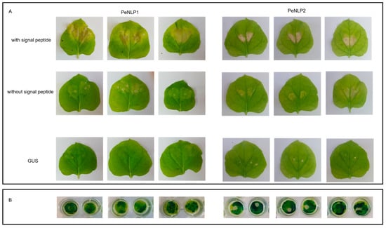 The transgenic A. tumefaciens strains were subsequently infiltrated into the leaves of tobacco plants. Chlorotic spots appeared around the infiltration site at 3–5 days after the agroinfiltration of PeNLP1 (Figure 3). Necrosis of the tissue around the infiltrated site was apparent 10 days after agroinfiltration of PeNLP1 constructs with a signal peptide (Figure 3). Infiltration of constructs without signal peptide resulted only in minor chlorosis and several minor necrotic spots (Figure 3A). Similarly, leaves infiltrated with constructs coding for PeNLP2 with signal peptide developed stronger necrosis than leaves infiltrated with PeNLP2 constructs without a signal peptide. The necrosis induced by PeNLP2, however, was more restricted, relative to the necrosis induced by PeNLP1, and developed 12 days after the infiltration. No signs of necrosis or other visible damage was observed in leaves in response to agroinfiltration with the GUS gene (Figure 3). GUS was chosen as a negative control, since it does not have any cytotoxic activity [16] and its expression can be easily verified and visualized (Figure 3B).