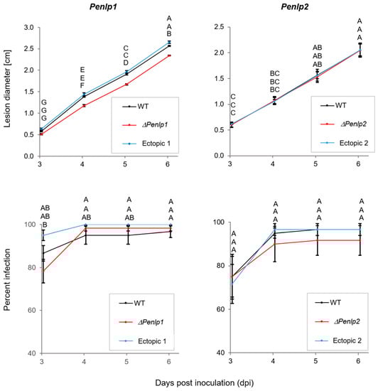 ‘Golden Delicious’ apples were inoculated with wild-type and transformant strains to examine pathogenicity. Fruits were wounded and 10 µL of spore suspension (105 conidia/mL) were added into each wound. For each treatment fifteen fruits with four wounds per fruit were used. Decay diameter and percentage of infected wounds were measured at 3, 4, 5, and 6 dpi. Results of one of three independent experiments are presented. Bars indicate standard error. Letters indicate significant differences at p < 0.05 based on nested one-way ANOVA followed by Tukey’s honest significant difference (HSD) test.3.5. Penlp1 and Penlp2 Knockout Mutants of P. expansum.