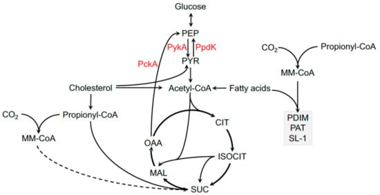 MTBC bacteria also have increased flexibility around the pyruvate node in metabolism and can convert pyruvate into phosphoenolpyruvate (PEP), which may be important when the bacteria metabolize cholesterol. Cholesterol degradation produces excess pyruvate and this intermediate can fuel gluconeogenesis through the production of PEP via pyruvate phosphate dikinase, PpdK activity (Figure 1) [90]. While subtle differences exist across the MTBC, the overwhelming evidence indicates that all of these bacteria primarily synthesize carbohydrates via gluconeogenesis and preferentially utilize lipids and/or amino acids to fuel central metabolic pathways.
