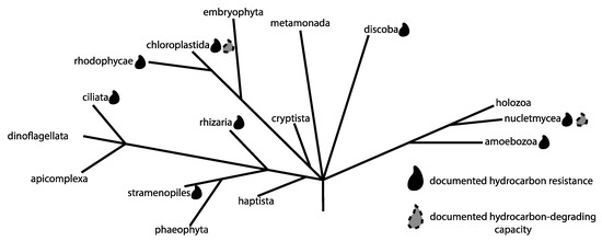 Diversity of eukaryotes, based upon Adl et al. [1]. Groups with noted resistance to hydrocarbons, or ability to degrade hydrocarbons, are indicated. It is important to note that not all taxa within the indicated groups exhibit these traits, as the tree covers all eukaryotic diversity and is therefore at extremely low taxonomic resolution. The well-known multicellular eukaryotes, i.e., animals, plants, and fungi are found within the Holozoa, Chloroplastida, and Nucletmycea respectively. These same groups also contain large numbers of microbial taxa.