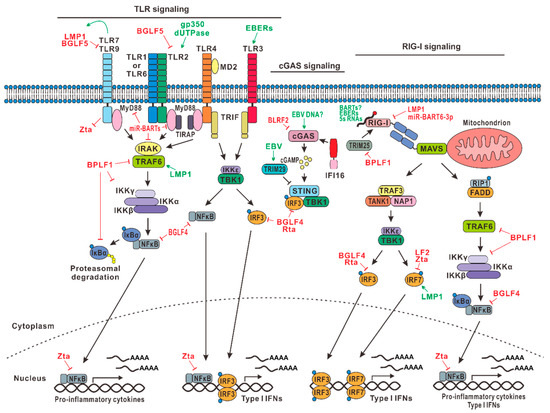 Epstein–Barr virus (EBV) perturbation of Toll-like receptor (TLR), RIG-I-like receptor (RLR), and cyclic GMP-AMP (cGAMP) synthase (cGAS) signaling. Signaling through TLR (left part of the diagram), RIG-I (right part), and cGAS (central part) is positively and negatively regulated by EBV proteins and RNAs. On the one hand, EBV proteins and RNAs inhibit these pathways to suppress antiviral interferons (IFN) and cytokine production to facilitate viral infection (highlighted in red). On the other hand, they can also activate some of these pathways to promote cellular growth and survival (shown in green). See text for further details.