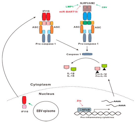 One NLR and two ALRs have currently been implicated in host–EBV interaction (Figure 2). While NLRP3 is the NLR that has been shown to be modulated by EBV oncoprotein LMP1 [66], AIM2 and IFI16 are the two ALRs that are known to be dysregulated by EBV [67,68]. Activation of NLRP3, AIM2, and IFI16 by EBV PAMPs such as its DNA genome results in the assembly of inflammasome. Inflammasome is the multiprotein complex formed to recruit the essential adaptor protein ASC, which recruits procaspase 1 through CARD–CARD interaction, leading to proteolytic activation of pro-inflammatory cytokines IL-1β and IL-18 [69].