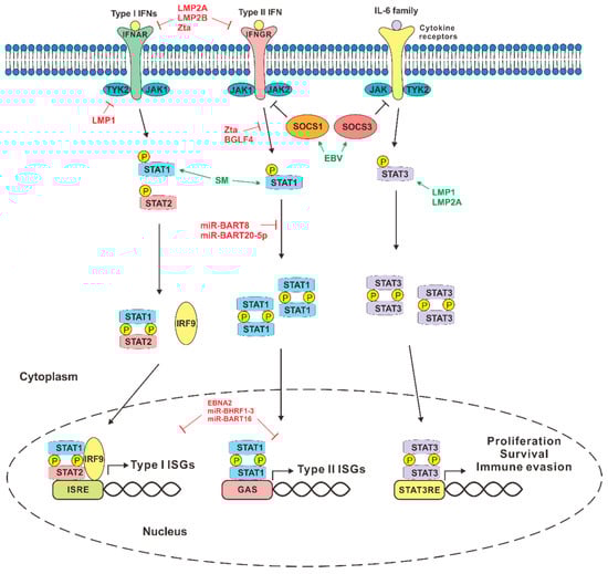 When expressed in cells, IFNs execute their antiviral functions through JAK-STAT signaling. It is therefore not surprising that EBV has developed multiple strategies to counteract not only IFN production but also IFN signaling. JAK-STAT pathways are activated when IFNs produced by virus-infected cells bind to their specific receptors. Type I IFNs including IFN-α, -β, -ε and other subtypes interact with IFNAR1 and IFNAR2, which are respectively associated with TYK2 and JAK1 tyrosine kinases, which phosphorylate and activate downstream transcription factors STAT1 and STAT2 (Figure 3). Together with IRF9, a ternary complex of STAT1-STAT2-IRF9, also called ISGF3, is formed to stimulate the transcription of interferon-stimulated genes (ISGs) such as MX-A, ISG15, ISG56, and OAS1 through IFN-stimulated response elements (ISREs) [117]. Type III IFNs such as IFN-λ bind to receptors IL-10-R2 and IFNLR1 to activate JAK1 and TYK2. On the other hand, IFN-γ is recognized by IFNGR1 and IFNGR2, leading to the activation of JAK1 and JAK2. These kinases phosphorylate and activate STAT1 to form homodimers, also known as GAF [118]. This dimer translocates into the nucleus to induce the transcription of ISGs such as IP10, IRF1, EGR1, CIITA, and CCL2S through enhance elements named gamma activated sequence (GAS) [117].