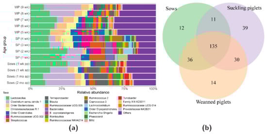 (a) Stacked bar plots showing the average percentage of bacterial taxa in sow and offspring faeces over time, (b) and a Venn diagram depicting the number of bacterial taxa that were unique and shared between sows, suckling, and weaned piglets, as analysed by the 16S rDNA sequencing.