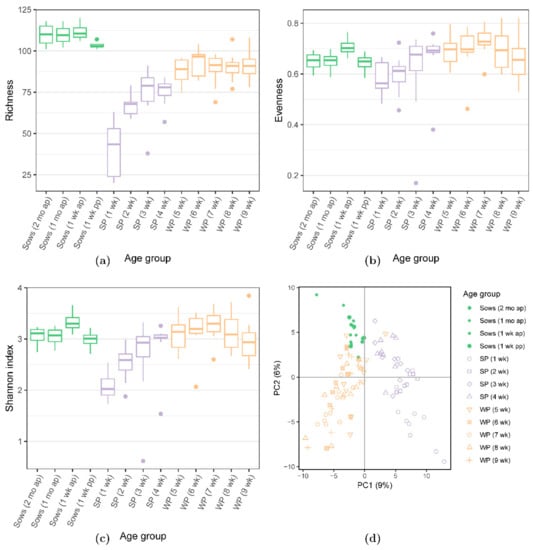 Diversity shown as (a) richness, (b) evenness, and (c) Shannon indices, and (d) a principal component analysis performed using the relative abundance of faecal microbial taxa in sows (green box plots), suckling (violet box plots) and weaned piglets (orange box plots) over time, as analysed by the 16S rDNA sequencing. Dots in figures (a–c) indicate outliers. ap: antepartum; pp: postpartum.