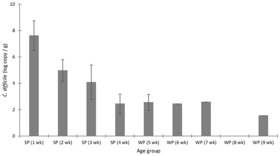 In the first two weeks of life, all piglets harboured C. difficile and at high concentrations up to log10 9.29 copy number/g faeces. The concentration of C. difficile gradually decreased as the piglets aged (Figure 3).