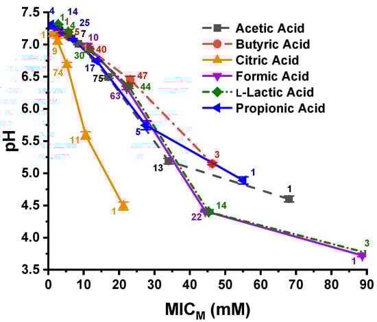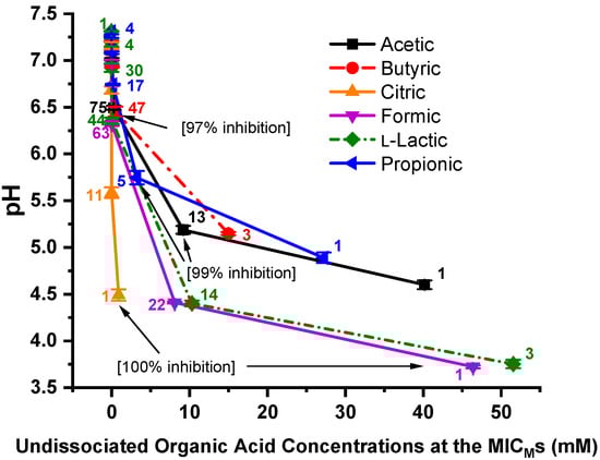 Plot of pH vs. MICMs of the 96 Campylobacter jejuni strains against the six undissociated organic acids, propionic, l-lactic, formic, citric, butyric, and acetic acids. The number of strains is displayed adjacent to the MICM data points. Each pH data point is the mean and standard deviation from triplicate samples.