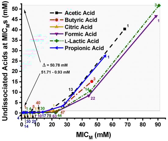 Concentrations (mM) of the six undissociated organic acids—propionic, l-lactic, formic, citric, butyricand acetic— at the MICMs of the 96 C. jejuni strains. The large shaded area shows the difference between the undissociated l-lactic acid and citric acid levels required for disinfection of all 96 strains by all organic acids tested; Δ = 50.78 mM. The number of strains is displayed next to each MICM data point.