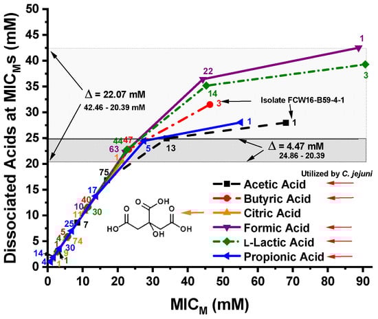 The plot of pH vs. dissociated OA concentrations at the C. jejuni MICMs against the six OAs is shown in Figure 5. The number of strains is displayed adjacent to each data point. The narrow, light green vertical box (20.39 mM) depicts the data point for bacterial inhibition of all 96 strains by dissociated citric acid. The larger, light blue vertical box (22.72 to 24.86 mM dissociated OAs) encompasses the data points for bacterial inhibition of 97–99% of the C. jejuni strains by dissociated butyric, acetic, and propionic acid. The red box encompasses the data points for bacterial inhibition of 97–99% of the strains by l-lactic acid and formic acid. Each pH data point is the mean and standard deviation of triplicate samples.