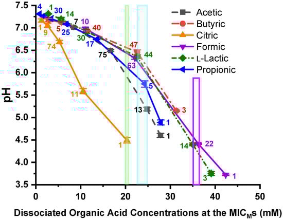 pH vs. MICMs of the 96 C. jejuni strains against the six dissociated organic acids—propionic, l-lactic, formic, citric, butyric, and acetic acid. The number of strains is displayed adjacent to each MICM data point. The small, light green, vertical box at 20.39 mM shows the inhibition of 100% of the strains by dissociated citric acid. The larger light blue vertical box (22.72 to 24.86 mM) encloses the inhibition of 97–99% of the C. jejuni strains by dissociated butyric, propionic, and acetic acid, Δ = 2.14 mM. The magenta vertical box (35.11 to 36.36 mM) encloses the inhibition of 97–99% of the C. jejuni strains by dissociated l-lactic and propionic acid, Δ = 1.25 mM. Each pH data point is the mean and standard deviation of triplicate samples.