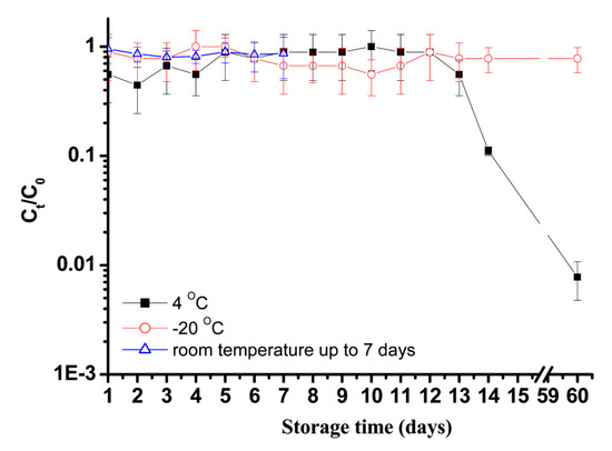 - Olson, M.R.; Axler, R.P.; Hicks, R.E. Effects of freezing and storage temperature on MS2 viability. J. Virol. Methods 2004, 122, 147–152. [Google Scholar] [CrossRef]