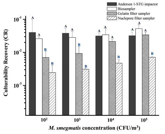 Relative culturable collection efficiencies of bioaerosol samplers for capturing airborne M. smegmatis. The indicator CR was used to adjust the initial culturable concentration in the nebulizer to determine the biological performance of the tested samplers. Samplers with higher CR values can preserve more culturability of M. smegmatis under the sampling conditions. Samplers with the same letter (e.g., A versus A; B versus B) have similar CR values that are not significantly different (p > 0.05, Dunn’s multiple comparison test). However, if samplers with different letter (e.g., A versus B), their CR values are significantly different. Experiments were performed in triplicate and the data shown represent the mean ± standard error of the mean.
