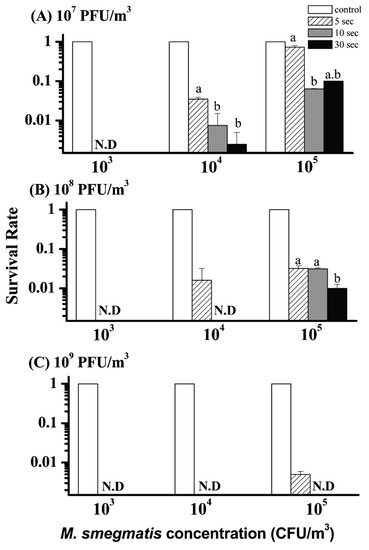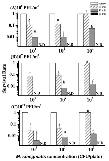 Bactericidal effect of different concentrations, (A) 108, (B) 109, and (C) 1010 PFU/m3, of ϕBTCU-1 aerosols on an agar plate contaminated with different concentrations of M. smegmatis at three exposure times of 10, 30, and 60 min (phase two study). The survival rate was calculated as the log10 of Nt/N0, where N0 is the number of bacterial colonies recovered from challenging with water fog and Nt is the number of colonies recovered from challenging with ϕBTCU-1 aerosols. The histogram bars with the same letter represent they have similar survival rates that are not significantly different (p > 0.05, Dunn’s multiple comparison test). Experiments were performed in triplicate and the data shown represent the mean ± standard error of the mean. N.D. means not detected.