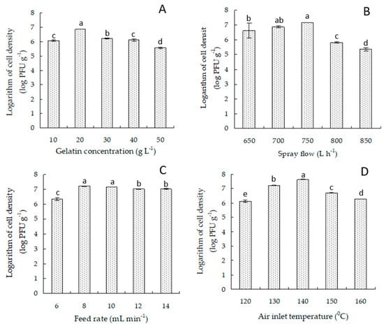 Effects of gelatin concentration (A), spray flow (B), feed rate (C), and air inlet temperature (D) on cell density of Bdellovibrio sp. strain F16 in the spray-dried powder. Data presented as the mean of triplicate spray-drying trials and standard deviations (SD) are indicated by the vertical bars. Bars with different lowercase letters are statistically different (p < 0.05).