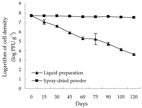 The survival of Bdellovibrio sp. strain F16 in the spray-dried powder and liquid preparation during room temperature storage is shown in Figure 4. The result showed that the survival of Bdellovibrio sp. strain F16 was greatly improved in the encapsulated powder, compared with that in the liquid preparation, with 3.5 × 107 PFU g−1 still alive after 120 days of room-temperature storage. However, a dramatic decline in the cell density of Bdellovibrio sp. strain F16 was observed in the liquid preparation, showing only 4.4 × 103 PFU mL−1 of Bdellovibrio sp. strain F16 alive after 120 days of room-temperature storage. This indicates that the encapsulated Bdellovibrio powder presents better storage stability than the liquid preparation.
