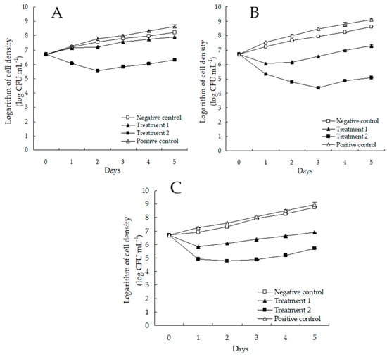 Prior to this assay, suspensions of V. cholerae strain BB31, V. parahaemolyticus strain G1, and V. vulnificus strain A2 were, respectively, prepared as described by Lin et al. (2007) []. The gamma-irradiation-killed Bdellovibrio sp. strain F16 was obtained according to Altay et al. (2018) [], and its powder was prepared using the spray-drying process optimized above. The antibacterial effect of Bdellovibrio powder against the whiteleg shrimp-pathogenic vibrios was conducted in triplicate and carried out in glass flasks. In the treatment flasks, the Bdellovibrio powder and a suspension of a pathogenic strain were independently inoculated into 200 mL of autoclaved filtered farm water to final concentrations of 0.4, 0.8 mg L−1, and 5.0 × 106 CFU mL−1. The mixtures were then incubated at 30 °C with shaking at 180 rpm for 5 days. In the positive control flasks, the gamma-irradiation-killed Bdellovibrio powder (with a final concentration of 0.8 mg L−1) and a suspension of a pathogenic strain (with a final concentration of 5.0 × 106 CFU mL−1) were independently inoculated into autoclaved filtered farm water and incubated as mentioned above. In the negative control flasks, only a pathogenic strain was inoculated in autoclaved filtered farm water and incubated as mentioned above. The cell density of the pathogenic strains was measured at intervals of one day by spread-plate counts on thiosulfate-citrate-bile salts-sucrose (TCBS) agar [].