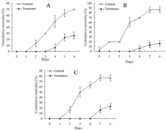 Protection of whiteleg shrimp by Bdellovibrio powder against the shrimp-pathogenic V. cholerae (A), V. parahaemolyticus (B), and V. vulnificus (C); control: 0 mg L−1 Bdellovibrio powder; treatment: 0.8 mg L−1 Bdellovibrio powder. Data are presented as the mean ± SD. Any differences observed are considered statistically significant at p < 0.05 according to Duncan’s test.