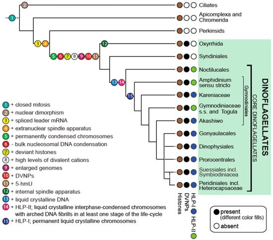 Nuclear character state evolution in dinoflagellates. Model depicting a consensus phylogeny of dinoflagellates and the progression of nuclear character state changes. Dotted branches indicate uncertain placements of taxa. Modified from Janouškovec et al. (2017) [2] and extended.