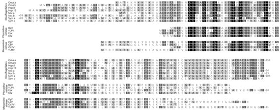 Sequence alignment of dinoflagellate/viral neucleoproteins (DVNPs) from selected species of dinoflagellates, Phycodnaviridae, and the newly proposed Mesomimivirinae. Oma = Oxyrrhis marina; Hsp = Hematodinium sp.; Nsc = Noctiluca scintillans; Sym = Breviolum (Symbiodinium) minutum; BpV = Bathycoccus sp. virus; YLPV = Yellowstone Lake phycodnavirus; OlV = Ostreococcus lucimarinus virus; PgV = Phaeocystis globosa virus; CeV = Chrysochromulina ericina virus; OLPV = Organic Lake phycodnavirus; YLMV = Yellowstone Lake mimivirus.