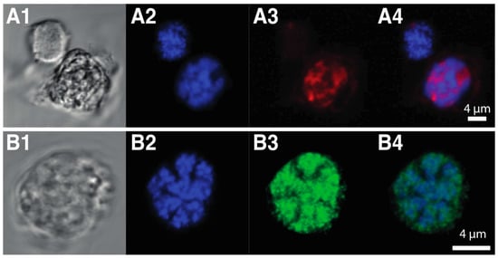 Visualization of two unique characters of dinoflagellate chromatin. (A) Assay for Transposase-Accessible Chromatin (ATAC)-see results (A1) Brightfield image of two Hematodinium sp. cells. (A2) DNA staining of the same cells (A3) ATAC-see results show that in dinoflagellates at least two chromatin states exist with one nucleus highly stained while a second nucleus is not affected. This resembles accessible euchromatin and inaccessible heterochromatin states found in nuclei of other non-dinoflagellate eukaryotes. (A4) Merged image of A2 and A3. (B) DVNP immunolocalization. (B1) Brightfield image of a Hematodinium sp. cell. (B2) DNA staining of the same cell. (B3) DVNP distribution in the nucleus revealed using a polyclonal anti-DVNP antibody. (B4) Merged image of B2 and B3.