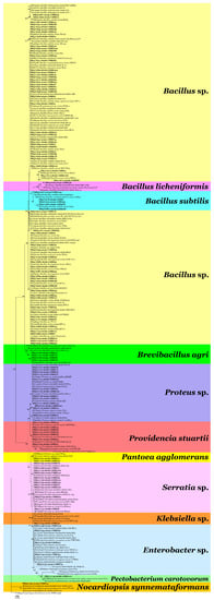 A total of 117 culturable bacterial isolates have been recovered in the time course of this study (Figure 1). Around 65% of them were Gram-positive and belonged to the genera Bacillus, Brevibacillus and actinomycete genus Nocardiopsis. Species diversity within genera was high and reached up to minimum of eight species within the genus Bacillus. The remaining 35% of the Gram-negative isolates belonged to the genera Proteus, Providencia, Serratia, Pantoea, Klebsiella, Enterobacter and Pectobacterium (Figure 1).