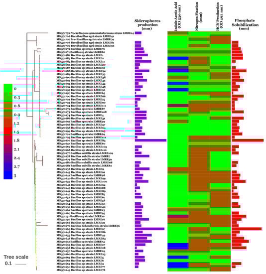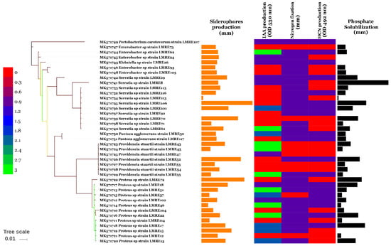 The culturable collection was then evaluated for its PGP potential by the analysis of direct and indirect PGP capacities. Direct PGP activities have been performed by screening for growth on nitrogen free medium, phosphate solubilization, siderophores and IAA production. Half of the isolated bacteria were able to express nitrogenase. The most productive genera were Bacillus, Proteus and Serratia. Similar results have been reported in Ji et al. [55] where Bacillus species have been identified as diazotrophic bacteria. Rice seeds treated with these bacteria showed improved growth, increases in height and dry weight, and antagonistic effects against pathogenic fungi [55]. Similarly, Hongrittipun et al. [56] recovered numerous nitrogen-fixing bacteria from roots and leaves of rice.