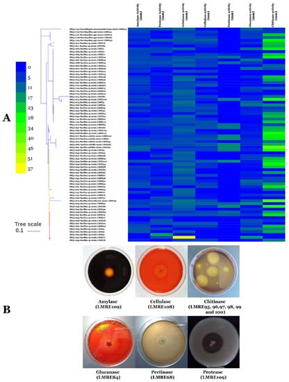 (A) Heat-map and (B) in vitro extracellular enzyme (amylase, protease, gelatinase, cellulase, pectinase, glucanase and chitinase) activity of Gram-positive bacterial isolates.