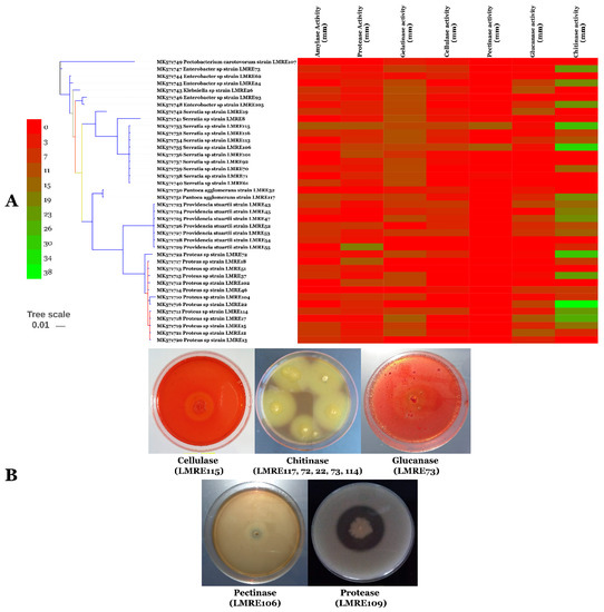 Indirect PGP activities have been checked by screening of microbiome isolates for extracellular enzyme production (protease, gelatinase, chitinase, cellulase, amylase, pectinase and glucanase) and for HCN production. Extracellular protease production was positive for 107 endophytic bacteria and maximum protease activity was recorded in LMRE 30 with halo diameter of 38.12 mm. Gelatinase production was observed in 100 bacterial isolates that were able to degrade gelatin. Bacillus sp. LMRE 77 exhibited the highest activity (57.71 mm of halo diameter). Chitinase production was produced by 83 bacterial strains giving chitinolytic zones in plate clearing assay. Among them, strain Serratia rubidacea LMRE 106, Proteus sp. LMRE22 and 6 Bacillus strains (LMRE 9, LMRE 36, LMRE 86, LMRE 82, LMRE 108 and LMRE 110) produced maximum enzymatic activity reaching 40 mm halo diameters. Among the 78 CMC-ase-positive bacteria, 46 were able to produce a clear zone of degradation between 5 and 10 mm of halo diameter. Most of them were identified as Bacillus sp. For Amylase production and among the 87 positive strains, peak amylase activity was exhibited by bacterial strain Serratia rubidacea LMRE 115 that had a 13.35 mm halo diameter. Twenty isolates out of the collection exhibited pectinase production; among them 17 bacteria gave clear zones of more than 10 mm of halo diameter. Glucanase production was observed in 75% of bacteria tested, with LMRE 77 and LMRE 97 having the highest glucanase activity, with 17.96 mm and 16.82 mm halo diameters, respectively. Hydrogen cyanide production was observed in 49.58% of the bacterial collection (Figure 4A,B and Figure 5A,B).