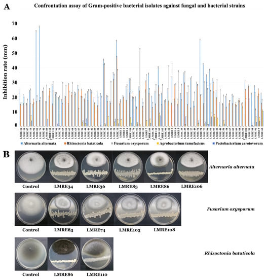 Endophytic bacteria recovered in this study were all tested for their antagonistic activity against two bacterial and three fungal phytopathogens. Results clearly showed that a collection of 78 bacterial isolates were able to inhibit both phytopathogenic bacteria Agrobacterium tumefaciens MAT2 and Pectobacterium carotovorum MAT3. Those findings are in agreement with several studies showing the potential of bacterial endophytes as biocontrol agents [53,66,67]. The highest antagonistic inhibitory potential against all bacterial and fungal phytopathogens was recorded in Bacillus genera with maximum growth inhibition of 52% against Fusarium oxysporum, and up to 40% against Alternaria alternata XSZJY-1 and Rhizoctonia bataticola MAT1. Among them, B. licheniformis LMRE 36 was able to inhibit 14 phytopathogenic Fusarium spp. for up to 35%. Multiple reports demonstrated the capacities of Bacillus strains to control Fusarium-induced plant diseases [68]. The antagonistic capacities of endophytic bacteria are explained by their plant growth promoting abilities, both directly and indirectly during normal and stress conditions [13].