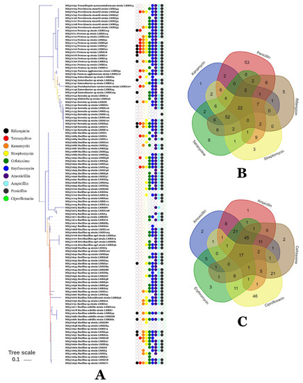 - Belbahri, L.; Chenari Bouket, A.; Rekik, I.; Alenezi, F.N.; Vallat, A.; Luptakova, L.; Petrovova, E.; Oszako, T.; Cherrad, S.; Vacher, S.; et al. Comparative genomics of Bacillus amyloliquefaciens strains reveals a core genome with traits for habitat adaptation and a secondary metabolites rich accessory genome. Front. Microbiol. 2017, 8, 1438. [Google Scholar] [CrossRef]