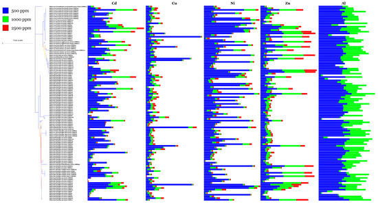 The 117 bacterial strains were tested for their ability to grow under different concentrations of five sodium sulfate salt (SO4) metals (Cd, Cu, Ni, Zn and Al), at different concentrations: 500, 1000 and 2500 ppm. Bacterial suspension (100 µL) was inoculated on LB broth supplemented with studied metal and incubated at 28 °C for 24 h in a rotatory shaker (120 rpm). Bacterial growth was monitored by measuring the OD at 600 nm using spectrophotometer (Auxilab Zuzi 4251/50, Tunisia) [19].