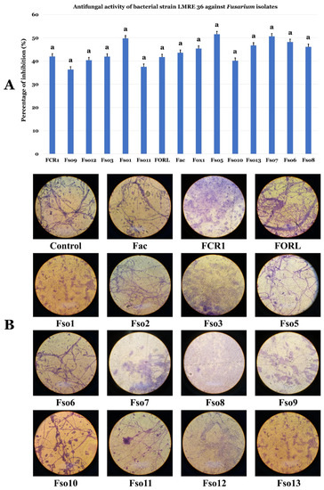 The antibacterial activity of endophytic strains was tested against two phytopathogenic Gram-negative bacteria: Agrobacterium tumefaciens MAT2 and Pectobacterium carotovorum MAT3, while antifungal activity was examined using three fungal pathogens: Alternaria alternata isolate XSZJY-1 (HQ873733), isolated from pistachios (Pistacia vera L.); and Rhizoctonia bataticola MAT1 and Fusarium oxysporum f. sp. radicis lycopersici FORL, isolated from greenhouse tomato roots. One selected strain, Bacillus licheniformis, with high antibacterial and antifungal potential, was tested for its antifungal activity against 14 Fusarium spp. (isolates Fso10, Fso9, Fso12, Fso11, FCR1, Fso1, Fso5, Fso6, Fso2, Fso3, Fac, Fso13, Fso7 and Fso8) provided by the Olive Tree Institute of Tunisia [39].