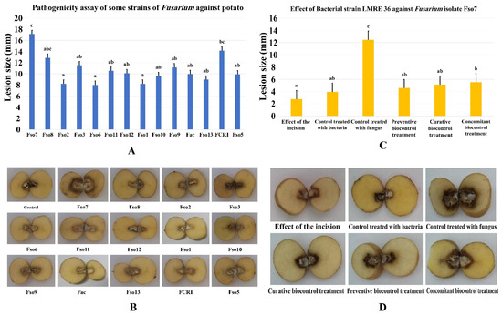 Before inoculation, two holes were made to a depth of 5 mm in each surface sterilized tuber. Inoculation was performed by adding a 5 mm bacterial plug 24 h before or after fungal infection in preventive and curative treatments respectively, while in the concomitant treatment, the antagonistic bacteria and the phytopathogenic fungus were added simultaneously. Non-inoculated tubers were used as controls, tubers infected but not treated were used as negative controls, and treated tubers were used as positive controls. This experiment was conducted 4 times. Penetration diameter was calculated as described previously [42].