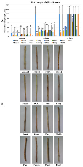 Disks (6 mm in diam.) from 2-week-old cultures of Fusarium spp. were grown in PDA containing test tubes, then sterile olive twigs were placed in direct contact with them. Disease assessments were made every 10 days, with at least three olive twigs per replicate, by measuring the rot length extension, until reaching complete twig infection. Therefore, evaluations stopped after 35 days. Test tubes with PDA discs without mycelia were used as controls [43].