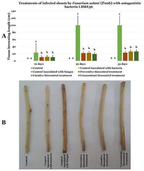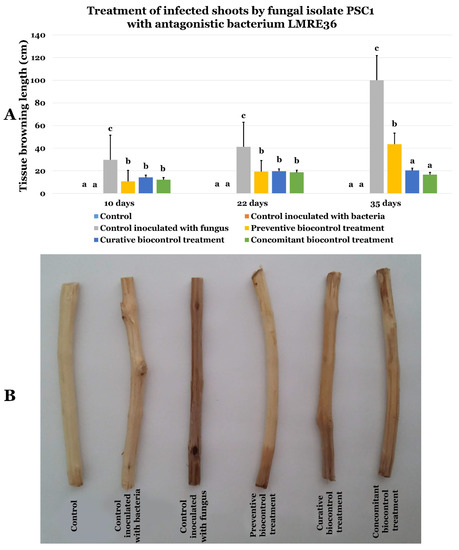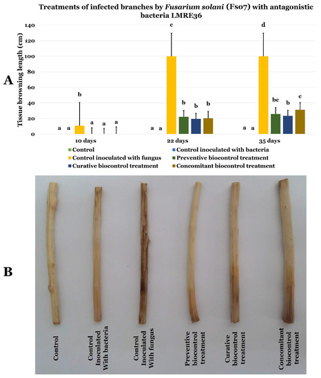 In the curative treatment, the phytopathogenic fungus Fusarium was inoculated in PDA test tube 24 h prior to inoculation with the antagonistic bacteria LMRE 36. The concomitant treatment received the antagonistic bacteria and the phytopathogenic fungus simultaneously. Three controls were applied, water control twigs, infected twigs (Fusarium inoculation) and inoculated twigs (LMRE 36 inoculation).