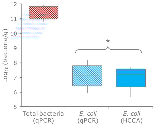 Counts of E. coli and total bacteria in the feces of 20 subjects. Boxes indicate the median and 25th and 75th percentiles; whiskers indicate the 10th and 90th percentiles. * indicates the means that did not significantly differ (p > 0.05, paired samples t-test). HCCA, HiCrome Coliform Agar (the selective medium for E. coli).