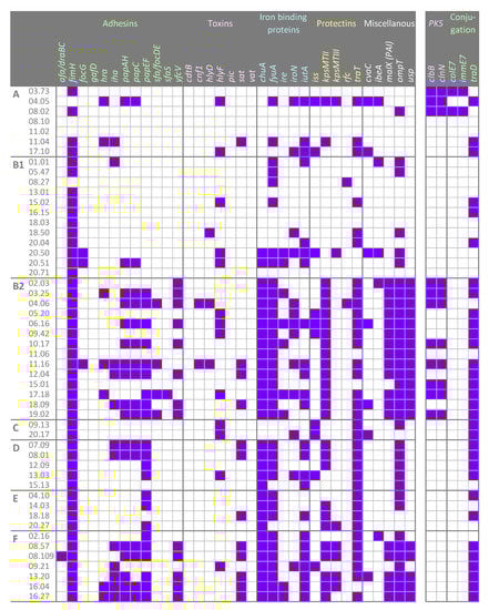 The pattern of genetic determinants in the 51 E. coli strains, ordered on the basis of their phylotypes. Virulence genes coding for adhesins, toxins, iron binding proteins, and protectins were screened. The presence of the pks pathogenicity island and other genes involved in the conjugation machinery were searched. Purple squares, presence; white squares, absence.