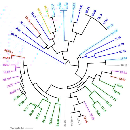 The great variability of pathogenicity-associated features suggests that the genetic determinants of virulence had a role in shaping the genome of the isolates. A significant co-occurrence was observed in a set of B2 and F strains for pap genes (papAH, papC, papEF), encoding proteins of the fimbria favoring the ascension of the urinary tract and promoting colonization and infection, sat, which is associated with a cytopathic secreted autotransported toxin exerting effect, kpsMTII, the marker of K2 capsular polysaccharides, which plays a main role in pathogenesis, chuA (heme receptor), yfcV (Yfc fimbria), along with fyuA, malX, usp, ompT (Figure 3; Figure 6). Among them, twelve strains, belonging to the phylogroups B2 (03.25, 04.06, 06.16, 10.17, 12.04, 18.09, and 19.02) and F (08.57, 08.109, 13.20, 16.04, and 16.27), presented a pattern of virulence genes similar to that of the strains responsible for urinary tract infections, on the basis of the presence of the genes chuA (heme receptor), yfcV (Yfc fimbria), along with fyuA (Yersinia siderophore receptor) and ompT (aspartyl protease) [35]. This reinforces the idea that it is possible that pathogenic E. coli potentially inhabit the gut of healthy subjects without instigating infections, although they can act as etiologic agents of extra-intestinal infections, without a clear distinction between commensal E. coli and pathogens.