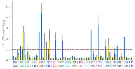 formation of E. coli strains on LBWS (blue bars) and M9glu (yellow bars). The specific biofilm formation index (SBF) is calculated as the ratio between the crystal violet absorbance at 570 nm and the culture turbidity at 600 nm, setting a threshold of 1 for biofilm producers (red dashed line). The reported data are means ± standard deviations of at least three independent experiments, each carried out in triplicate. The names of the strains are colored based on their phylogroups: A, cyan; B1, blue; B2, green; C, yellow; D, red; E, grey; and F, pink (hereafter referred to as LBWS and M9glu, respectively).