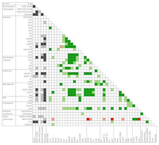 A co-occurrence analysis was applied to the whole set of genetic and function observations (Figure 6). The presence of pks islands and several virulence determinants was significantly associated (p < 0.05 or < 0.01) to certain genotypic classifications (such as the ERIC profile, the pulsotype, and the phylogroup). In particular, the genes encoding some adhesins (iha, papAH, papC, papF, and sat), iron binding proteins (chuA, fyuA, and iutA), protectins (kpsMTII and traT), and malX, ompT, usp, and traD were significantly associated to phylogroups and presented a significantly positive tendency to co-occur within the same strains (p < 0.05 or 0.01).
