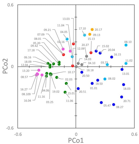 A Principal Coordinate Analysis (PCoA) was applied to assist in the identification of clusters, taking into account both their genetic and functional features (Figure 7). The first two coordinates were the most informative, accounting for approximately 28.9% and 10.2% of the total observed variances. In the PCoA plot, PCo1 separated B2 and F strains from B1, C, and E ones (negative and positive PCo1, respectively). F strains were grouped in two clusters. With respect to PCo2, most of the A, C, D, and E strains lie in the positive quadrants.
