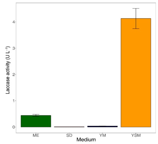 Laccase activities in culture supernatants after seven days of incubation. The error bars represent the standard deviation from triplicates. ME: Malt extract medium, SD: Sabouraud dextrose, YM: Yeast malt extract medium, YSM: YpSs medium.