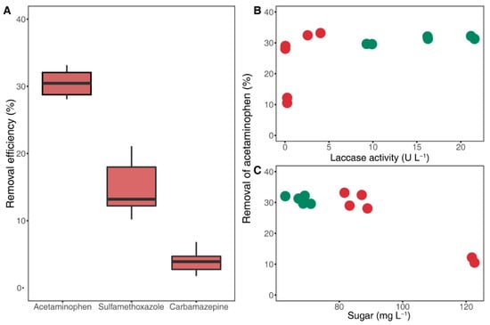 Pharmaceutical removal efficiency of laccase (A) and removal of acetaminophen related with laccase activities (B), and sugar concentrations (C); decreases in acetaminophen, sulfamethoxazole, and carbamazepine concentrations due to the activities of crude laccase from seven-day-old cultural supernatants. The green and red colors indicate nonwoody and woody lignocellulosic biomasses in (B) and (C), respectively.