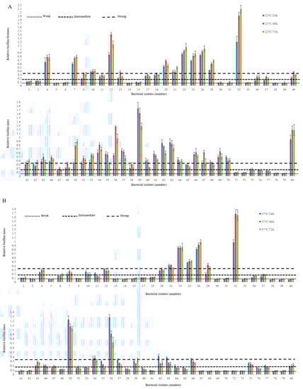 Figure 1. Biofilm formation by non-O157 STEC on a polystyrene surface at 22 °C (A) and 37 °C (B) using M9 medium. The vertical axis represents the median OD 590 nm of eight replicates of each strain. Horizontal lines represent the cut-off values between weak, intermediate and strong biofilm producers. The OD is defined as three standard deviations above the mean OD of the negative control. Strains were classified as follows: OD ≤ ODc (0.082), non-adherent; ODc < OD ≤ 2 X ODc, weakly adherent; 2 X ODc < OD ≤ 4 X ODc, moderately adherent; 4 X ODc < OD strongly adherent. OD, optical density; ODc, cut-off OD value.