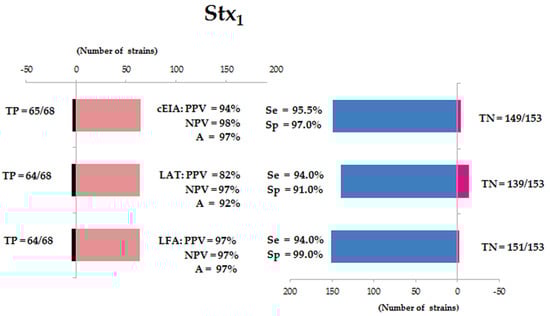 The analysis of the Stx1 detection in 68 strains (positive samples) and 153 strains (negative samples) by the three methods revealed for cEIA was PPV = 94%, NPV = 98%, A = 97%, Se = 95.5%, Sp = 97% and κ = 0.957. For LAT: PPV of 82%, NPV of 97% and A of 92%, thus the Se and Sp was 94% and 91%, respectively, and κ = 0.846. The parameters observed for LFA: 97% for PPV, 97% for NPV, 97% for A, 94% for Se, 99% for Sp and κ = 0.925 (Figure 1 and Figure 3).