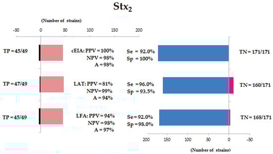 Concerning the detection of Stx2 by 49 strains (positive samples) and 171 strains (negative samples) by the three methods revealed for cEIA: PPV = 100%, NPV = 98%, A = 98%, Se = 92%, Sp = 100% and κ = 0.933. These values for LAT: PPV of 81%, NPV of 99% and A of 94%, thus the Se and Sp was 96% and 93.5%, respectively, and κ = 0.829. The parameters observed for LFA: 94% for PPV, 98% for NPV, 97% for A, 92% for Se, 98% for Sp and κ = 0.883 (Figure 2 and Figure 3).